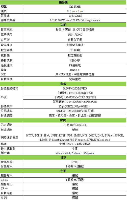 - 具寬動態,3D降噪、背光補償、自動白平衡。